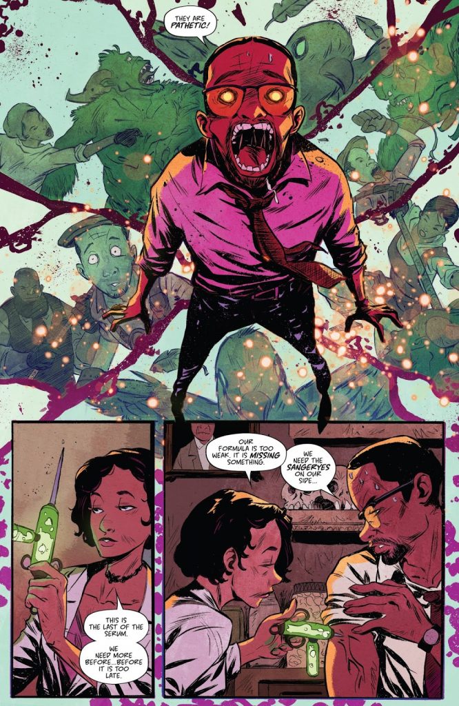 Ici, cette haine transforme les individus en monstres difficilement contrôlables. Les voies pour les combattre sont incarnées par la famille Sangerye, dont la culture ancestrale vise à soigner ces individus, et un couple qui cherche à développer un sérum qui permettrait de faire en quelque sorte usage de cette haine pour dominer par la force ces individus. Deux voies diamétralement opposées qui vont finir par s’entrechoquer. Là aussi le choix de David Walker et Chuck Brown est évident puisque la famille Sangerye est le centre du récit.