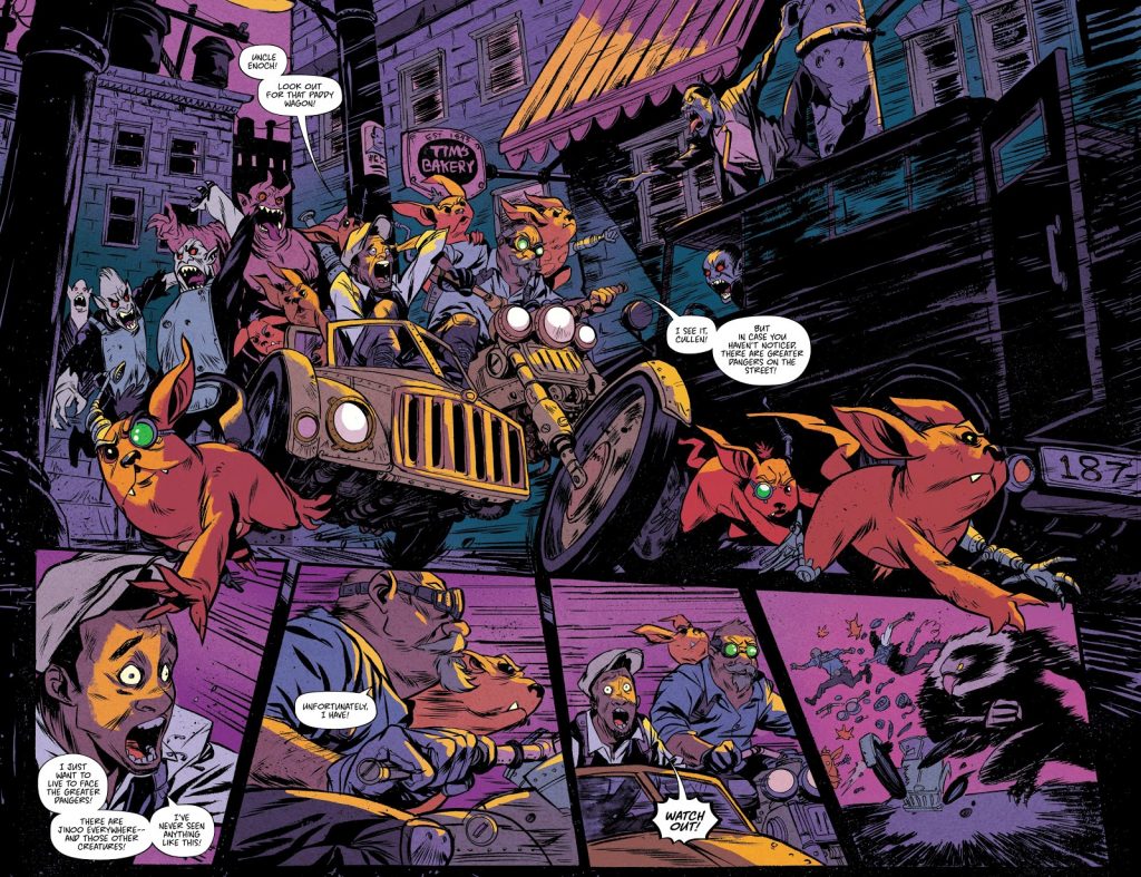 Comme on l’a dit, les dessins de Sanford Greene font en partie la réussite de Bitter Root. Au delà de la reconstitution, son trait caricatural fonctionne très bien pour cette ambiance « années 20 » et le dynamisme de ses planches embarque tout sur son passage. Les couleurs, qu’il réalise avec Rico Renzi, dans des tons mauves et verts sont douces et donnent un côté irréel à cette ambiance surnaturelle.
